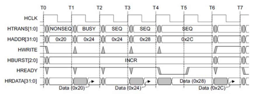 - 슬레이브는 해당 주소의 데이터를 읽어 준비한 후 RDATA 신호로 데이터를 마스터에게 전송합니다.